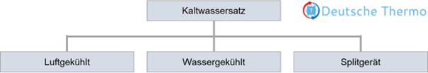 Sie sind von den Vorzügen der Technik überzeugt und wollen einen Kaltwassersatz kaufen? Dann geht es im nächsten Schritt um die passende Bauart. Zu Auswahl stehen luftgekühlte oder wassergekühlte Lösungen sowie Geräte in Split-Ausführung, wie die folgende Grafik zeigt.